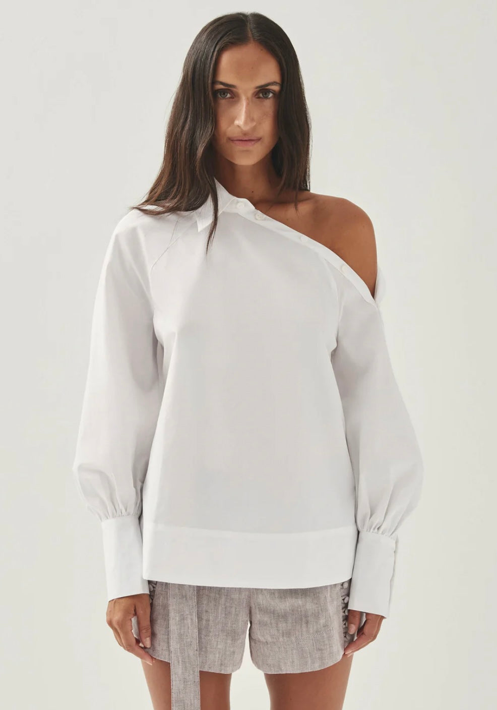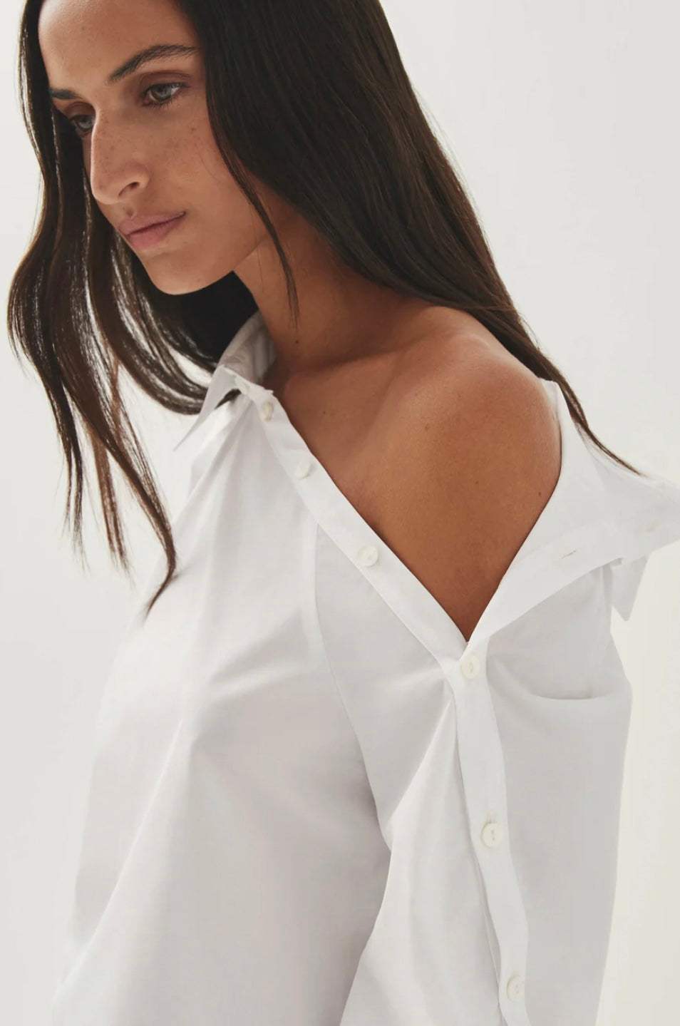 Klassiek en reinvented. Geknoopt van de schouder tot de nek. De Aiko witte poplin hemd heeft een wijde pasvorm en nieuw design.