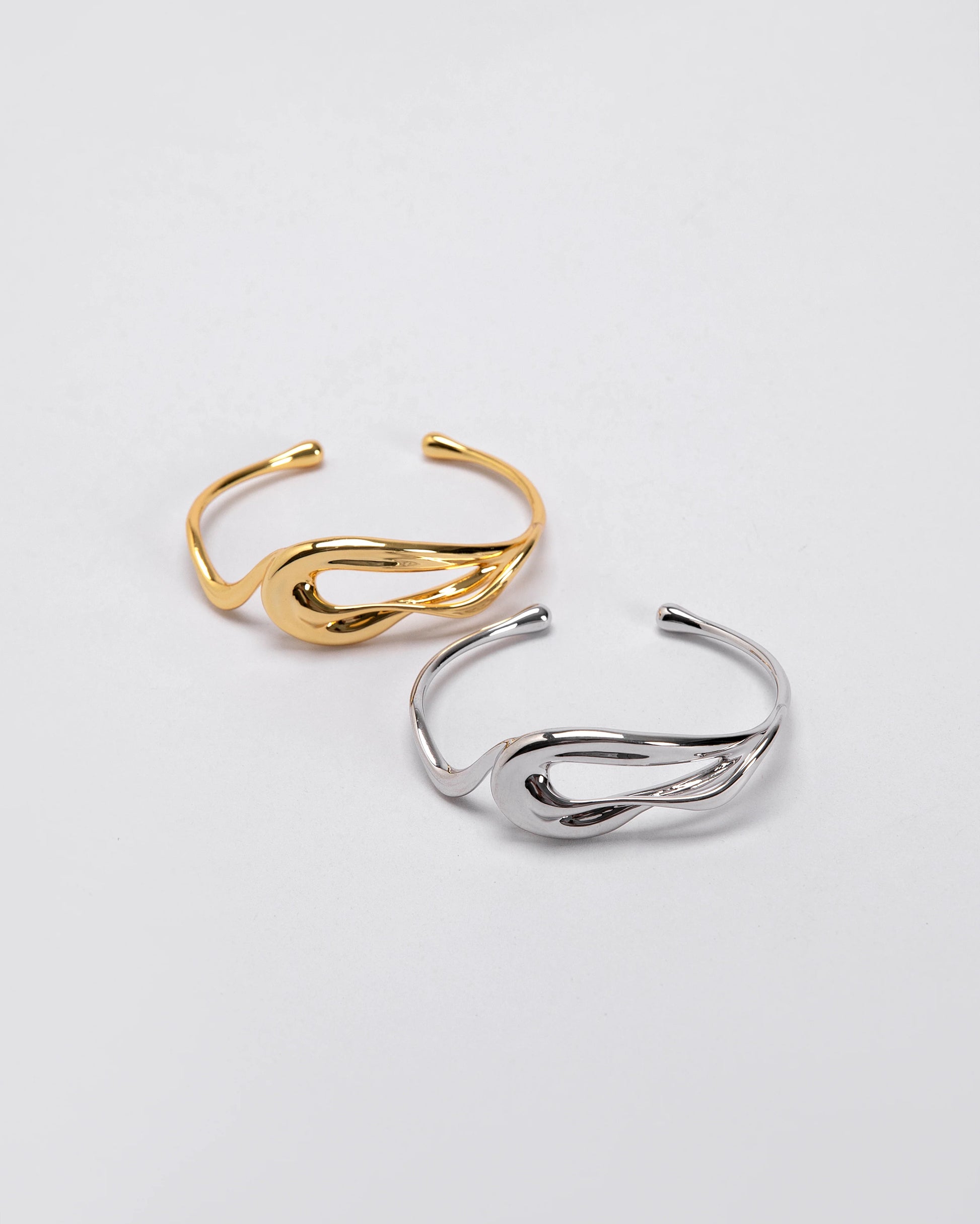 De Fluid Knot Cuff heeft een sculpturale, doorlopende golfachtige metalen vorm die in een sierlijk, golvend patroon verstrengelt en de serene beweging van water oproept. Het open ontwerp zorgt voor een lichte aanpassing voor een comfortabele pasvorm. Minimalistisch maar opvallend, dit stuk balanceert hedendaagse kunstenaarschap met ergonomische draagbaarheid.