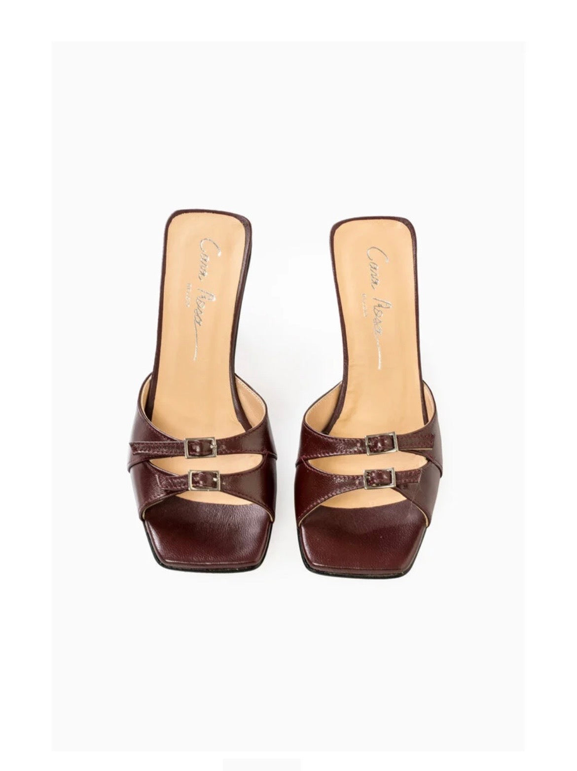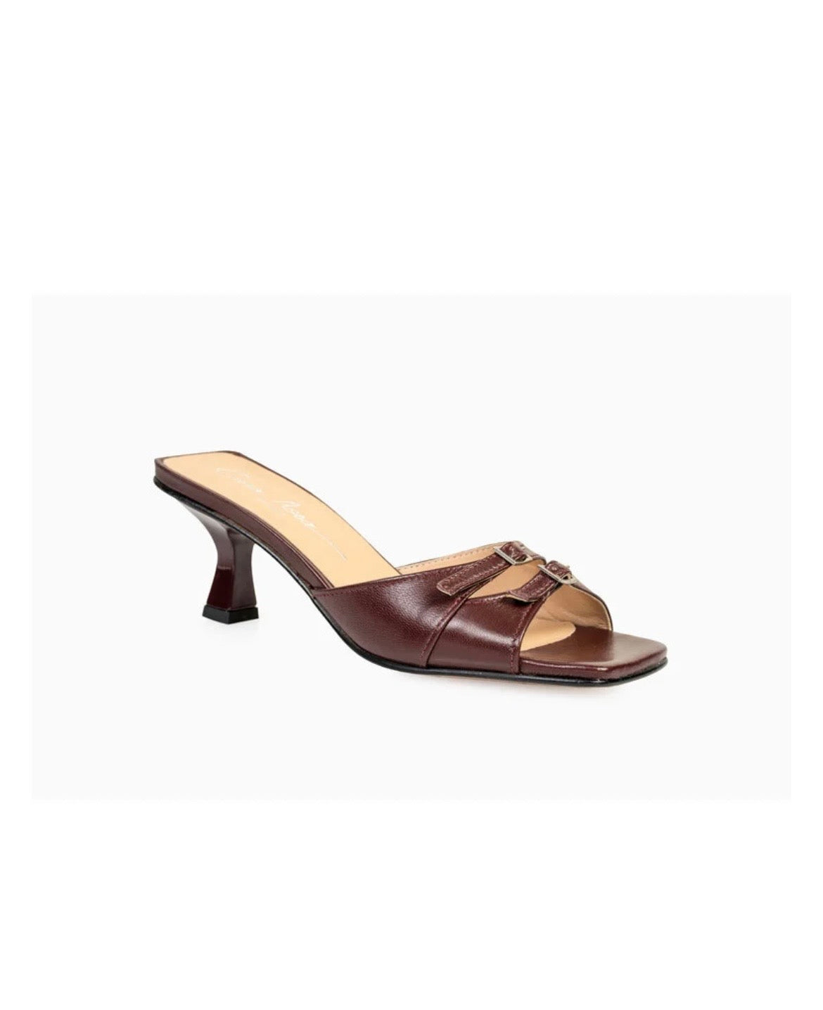 Deze Bordeaux sandalen zijn in Italië gemaakt van denim en staan op een 50mm kitten heel. Deze sandalen kunnen perfect aan je voeten worden aangepast dankzij de dubbele gespriempjes. Combineer ze met een korte jeans of draag ze met een fancy maatpak.