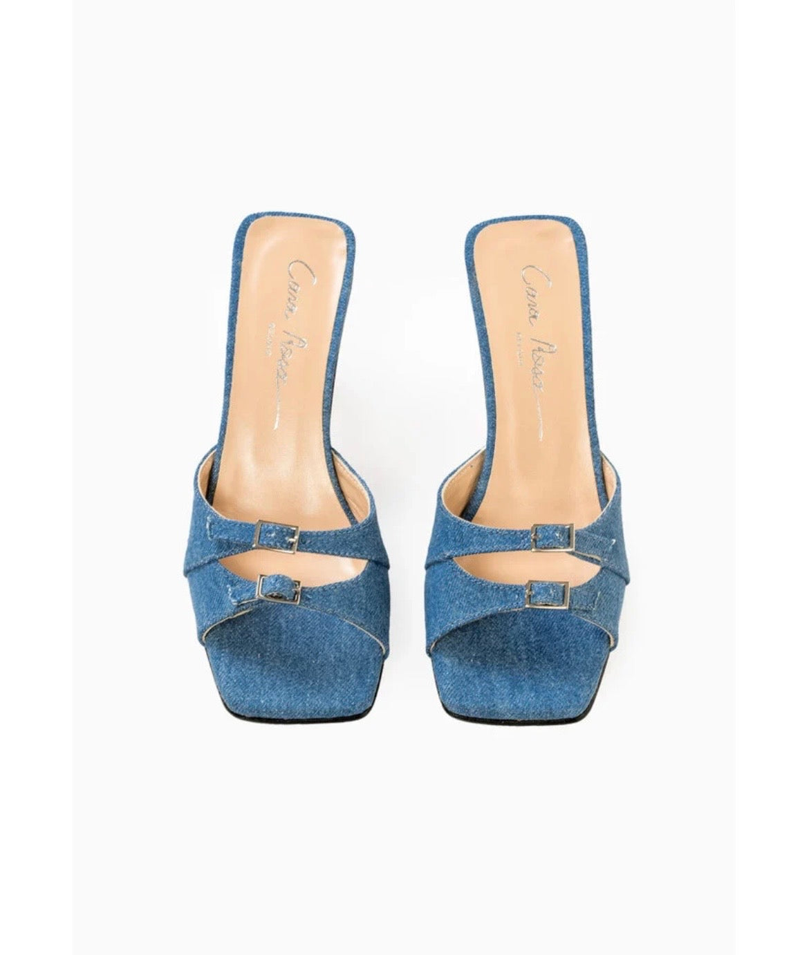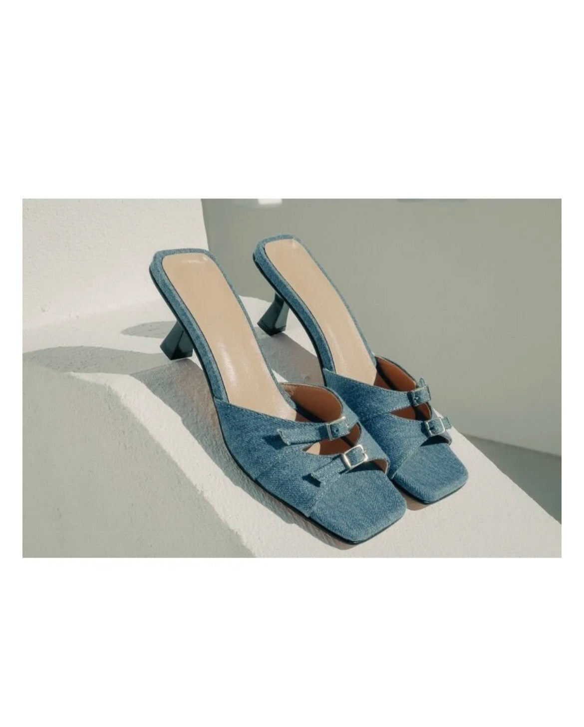 Deze blauwe sandalen zijn in Italië gemaakt van denim en staan op een 50mm kitten heel. Deze sandalen kunnen perfect aan je voeten worden aangepast dankzij de dubbele gespriempjes. Combineer ze met een korte jeans of draag ze met een fancy maatpak.