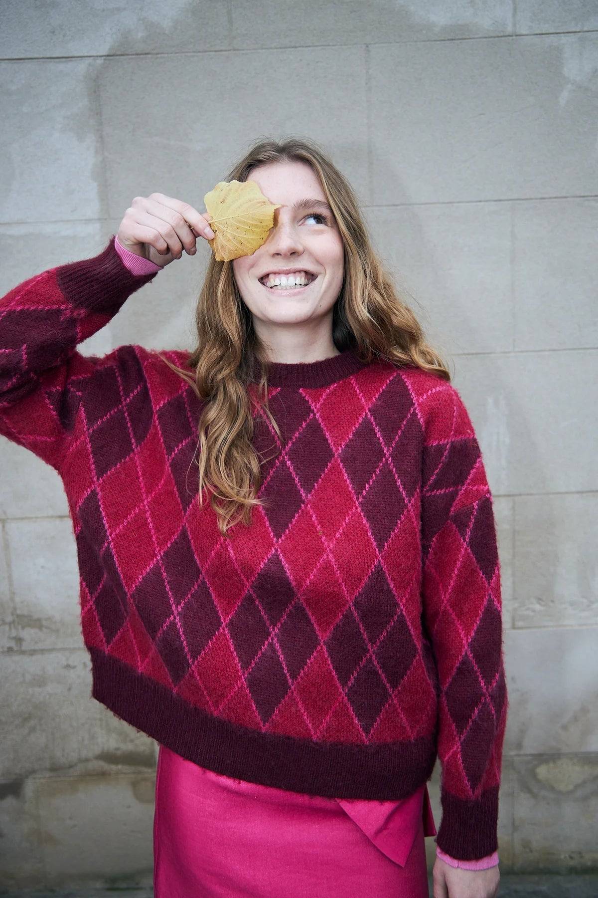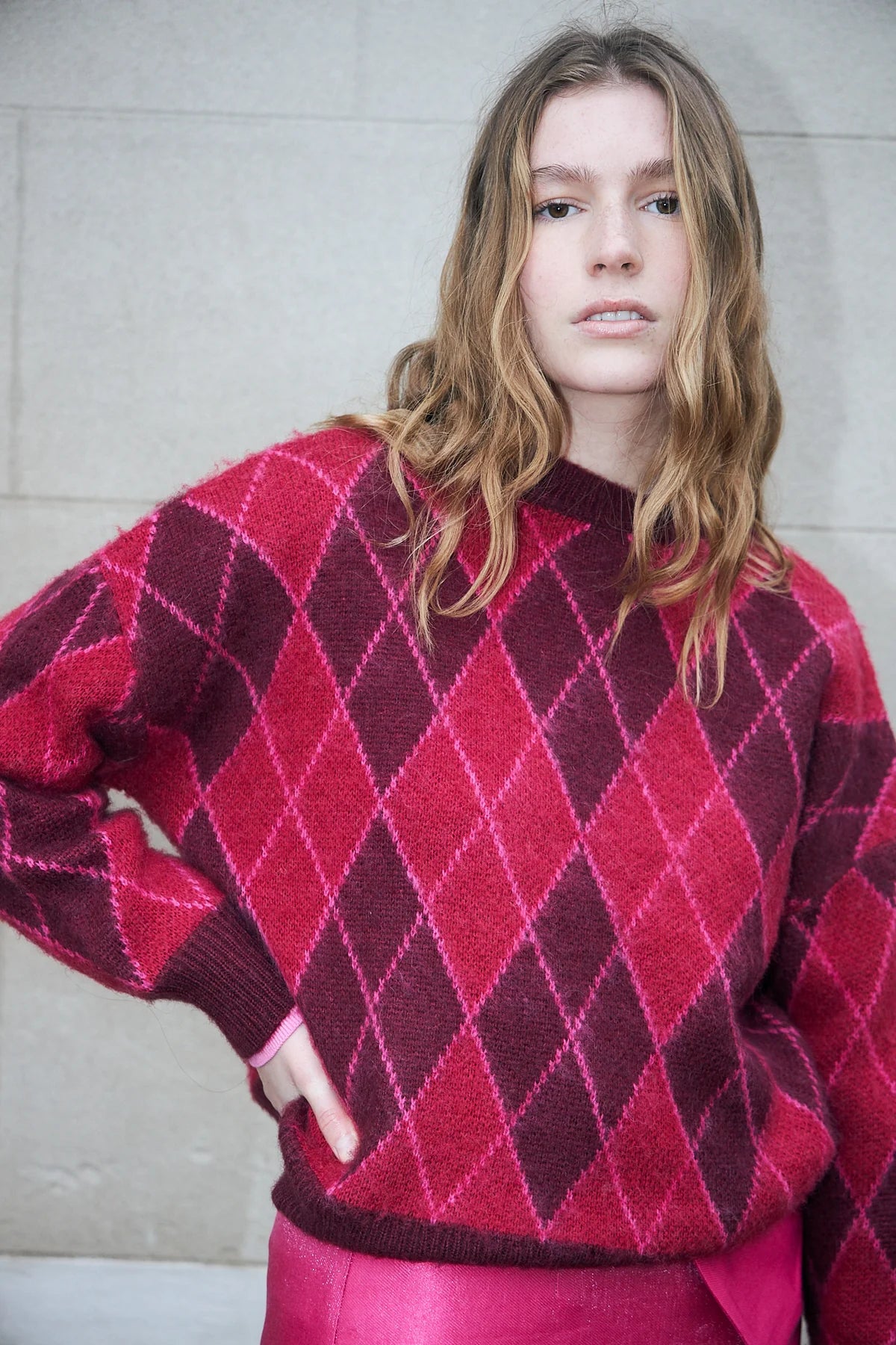 Een verreweg favoriet bij de wintergarderobe. Siacra's Pullover biedt comfort en karakter aan uw stijl met grafisch jaquardmonster in intense rode en roze toner. De blauwe, pluizige kwaliteit is een soort kram, de mens is een losse vormgever en een luxe en moderne stijl. Perfect voor het baden van de dagelijkse brug en daarna, als u met stijl wilt graven.