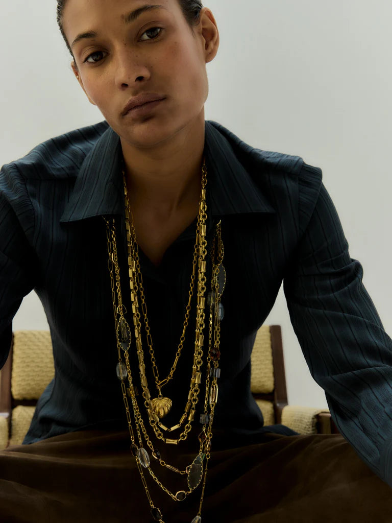 Lange ketting met meerdere strepen, gemaakt van drie messing kettingen met bescherming met verschillende ontwerpen en veelkleurige glazen stukken.
