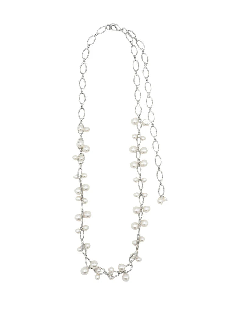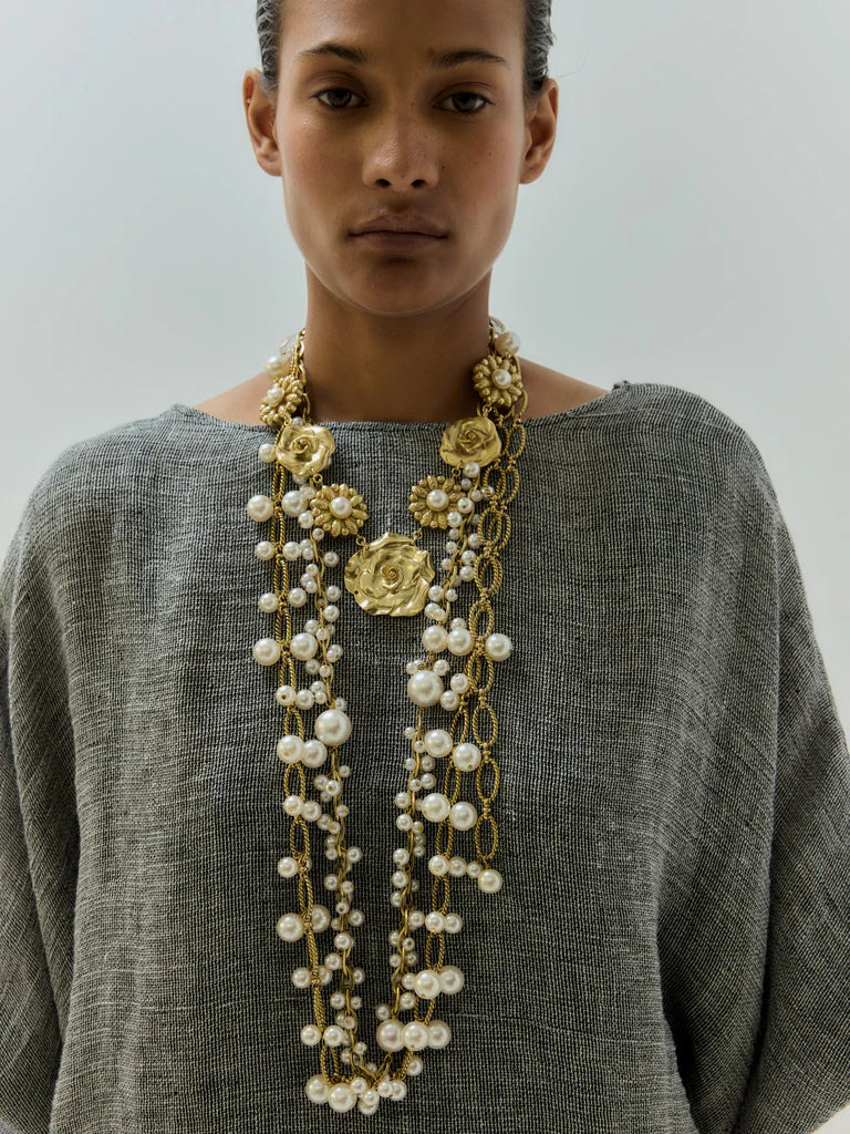 Lange ketting, gemaakt van een strook gestreepte ovale ringen en kralenballen met geknepen kristallen kern en nog een asymmetrische strook aan een van de uiteinden. Lengte: 1m.