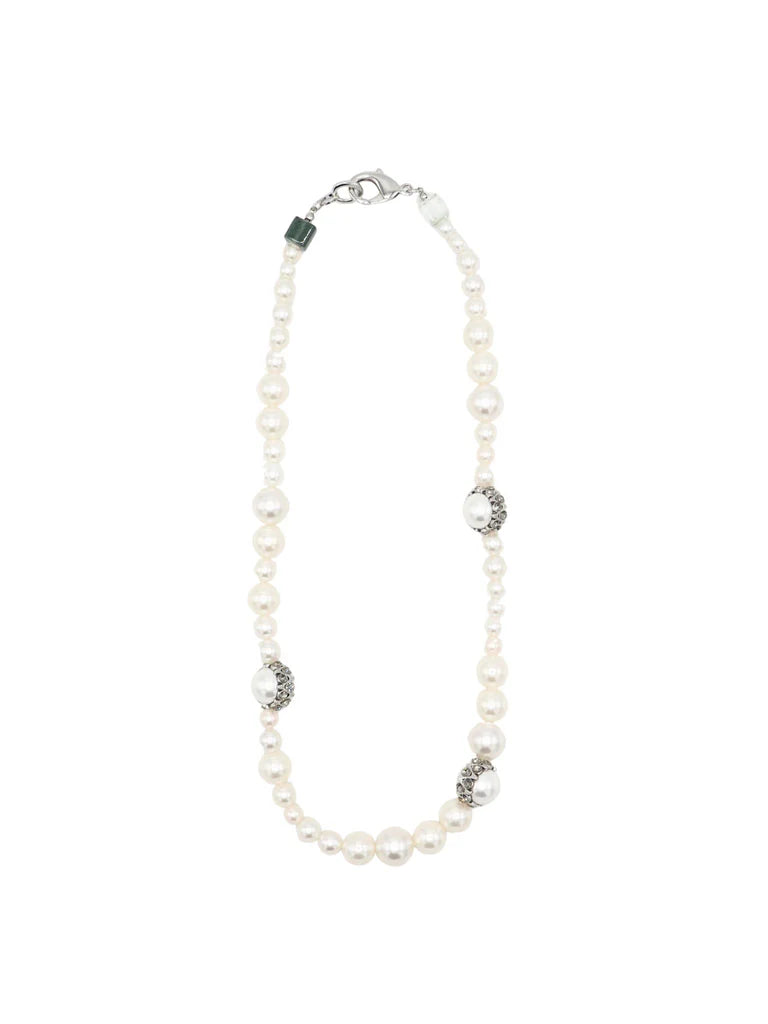 Halve borst ketting, gemaakt van parelballen met kristallen kern van verschillende grootte en vierkante kristallen aan de uiteinden.