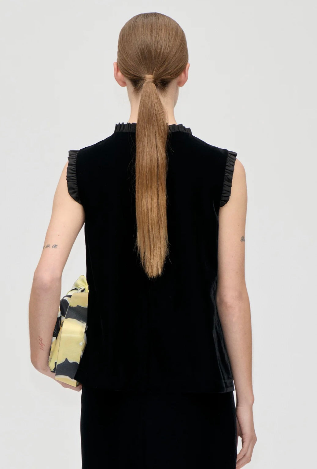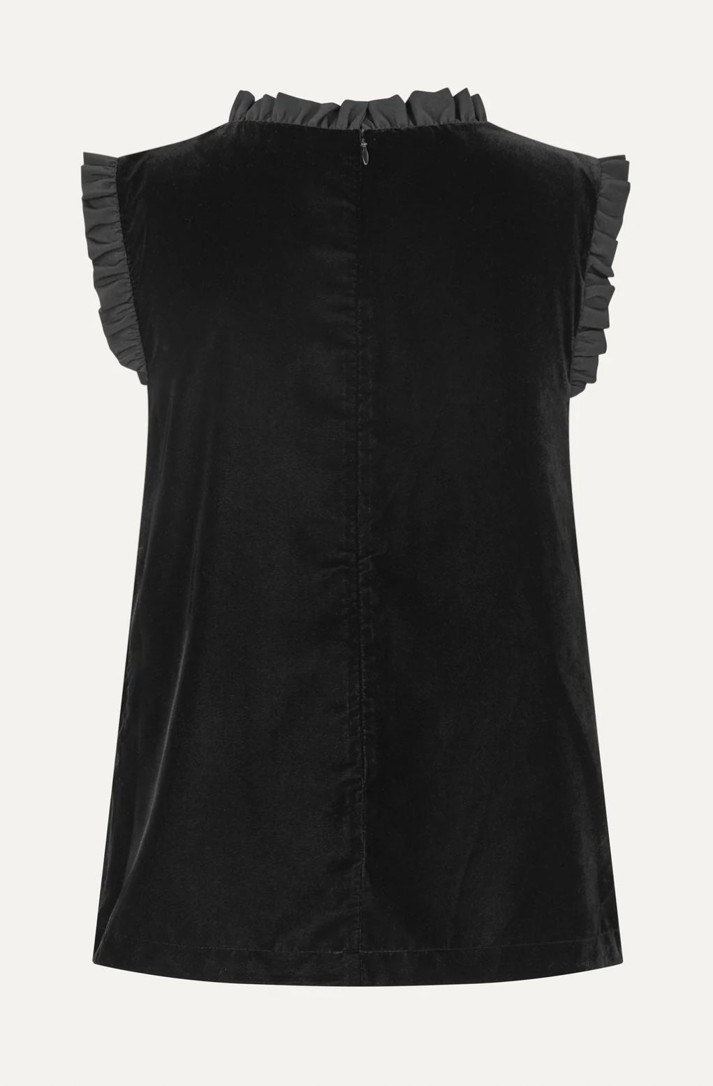 Elegante mouwloze top van zacht zwart velours. Ontworpen met rushes langs de halslijn en armsgaten, subtiel overslageffect aan de voorkant. Verborgen ritssluiting aan de achterkant.